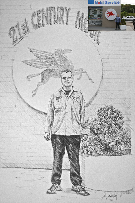 Fine line drawing from a photo using ball point pen. Varying the weight and length of the lines as well as the direction creates the textures and differentiates the darks from the lights. For portraits and any detailed drawings containing a fair amount of shading I like to use ball point pens for their versatility as compared to technical drawing pens (koh-i-noor rapidograph) that have one line weight, I find they are more suited to stippling or doing technical drawings which they were made for, although I have done many pieces using them, some of which are represented in this section of my web site. You will notice the difference by their almost clinical look, shading is done by either using different sized pens or by building up the thickness of each line or by stippling as mentioned before, which is a drawing comprised entirely of dots, the closer the dots the darker the area thereby creating shadows.